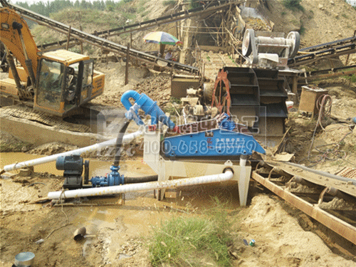 安徽宣城水洗砂生產(chǎn)線工藝流程:給料機+顎式破碎機+圓錐破碎機+制砂機+振動篩+螺旋洗砂機+葉輪式洗砂機,在此基礎(chǔ)上隆中重工為該客戶配置了雙泵型LZ-550細沙回收機一臺(如圖)。安